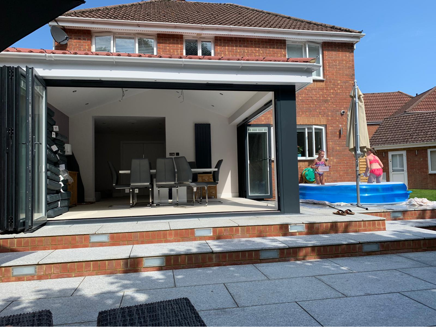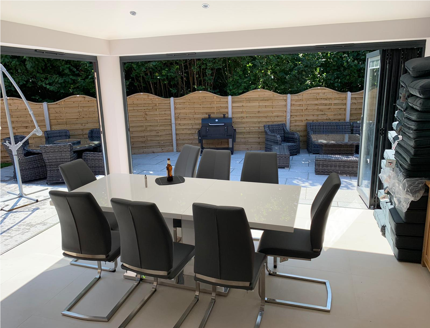 This house has undergone quite a few changes. The old conservatory was replaced with a new single storey extension with bifold doors wrapping around two sides. The Garden comprised of a full landscape makeover. Demolishing to the existing kitchen dining room to open it up into a large kitchen dining area which now leads directly on to the new summer room and out to the patioed garden.